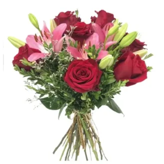 Este sofisticado ramo combina la intensidad de las rosas rojas, la suavidad de los lilium rosados y la pureza de los lilium blancos, creando un arreglo perfecto para llenar tu hogar de estilo, frescura y armonía. Ideal para decorar espacios como la sala, comedor o recibidor con un toque romántico y moderno.