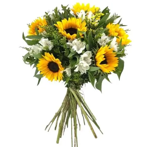 Transforma tu hogar con la energía de 6 girasoles y la suavidad de las alstroemerias blancas.