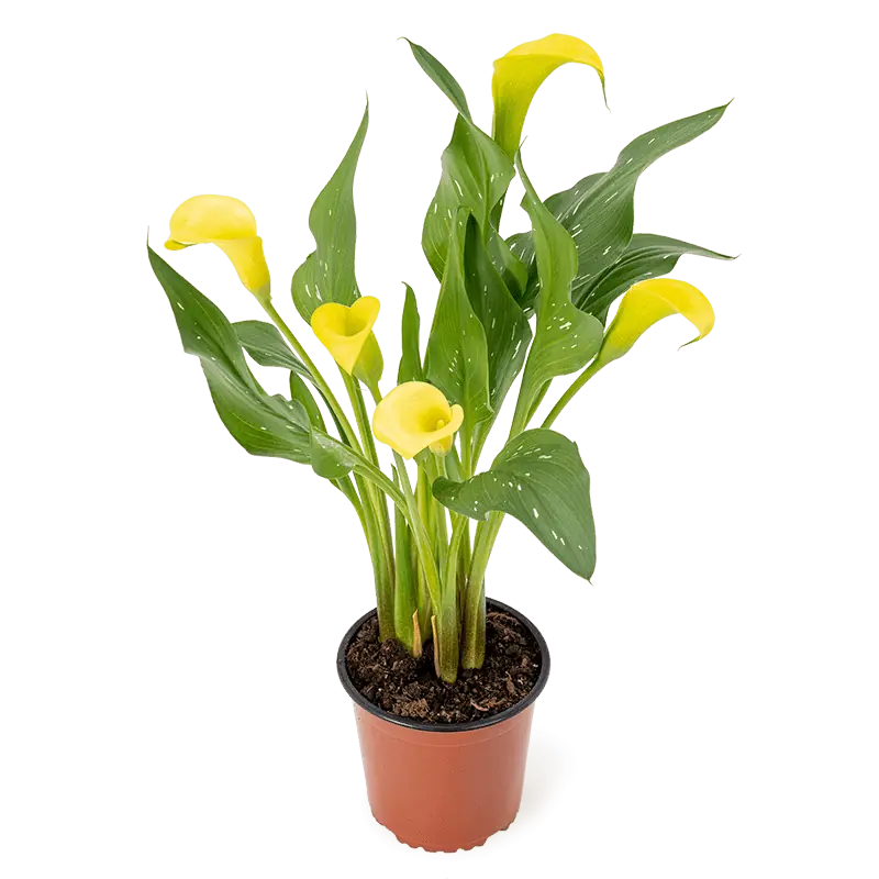 Cala Amarilla presentada en maceta de 12 cm. Planta vivaz de exterior con tallo carnoso subterráneo que rebrota cada año. Flores vistosas en varios colores que van del amarillo, rosa, naranja, etc. Florecen en primavera-verano. Requiere exposición en semisombra, riego moderado y trasplante sobre sustrato universal. Altura aproximada: 40 cm.