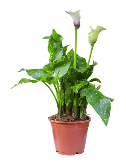 Cala blanca presentada en maceta de 12 cm. Planta vivaz de exterior con tallo carnoso subterráneo que rebrota cada año. Flores vistosas en varios colores que van del amarillo, rosa, naranja, etc. Florecen en primavera-verano. Requiere exposición en semisombra, riego moderado y trasplante sobre sustrato universal. Altura aproximada: 40 cm.