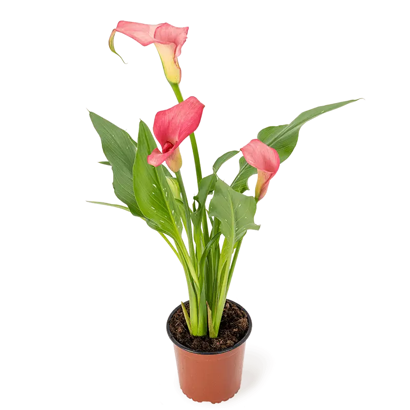 Cala rosada presentada en maceta de 12 cm. Planta vivaz de exterior con tallo carnoso subterráneo que rebrota cada año. Flores vistosas en varios colores que van del amarillo, rosa, naranja, etc. Florecen en primavera-verano. Requiere exposición en semisombra, riego moderado y trasplante sobre sustrato universal. Altura aproximada: 40 cm.