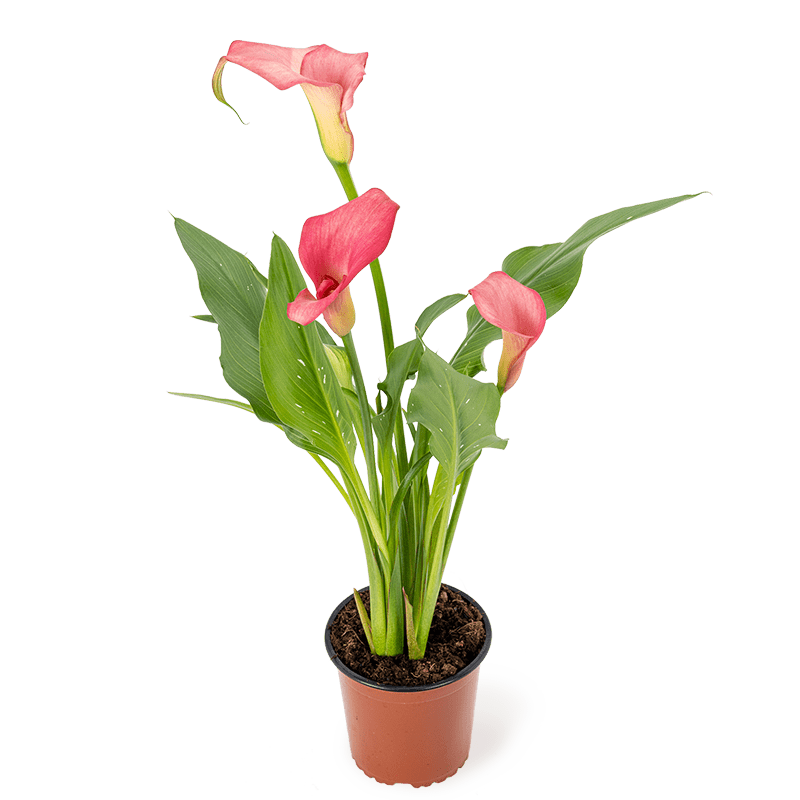 Cala rosada presentada en maceta de 12 cm. Planta vivaz de exterior con tallo carnoso subterráneo que rebrota cada año. Flores vistosas en varios colores que van del amarillo, rosa, naranja, etc. Florecen en primavera-verano. Requiere exposición en semisombra, riego moderado y trasplante sobre sustrato universal. Altura aproximada: 40 cm.