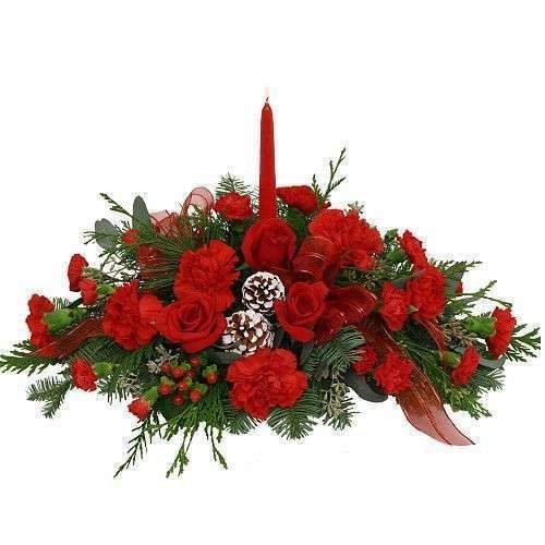 Magnífico arreglo de centro de mesa navideño con flores completamente rojas, incluidas rosas, y toque de pino hypericum rojos . Un regalo de Navidad cuidadosamente elaborado y diseñado por un florista.