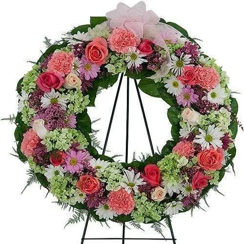 La corona rosa surtida es una hermosa muestra de cariño y afecto para rendir homenaje a un ser querido que ha partido. Esta corona está compuesta por una variedad de flores en tonos rosados, creando un arreglo armonioso y con significado. (no incluye atril)