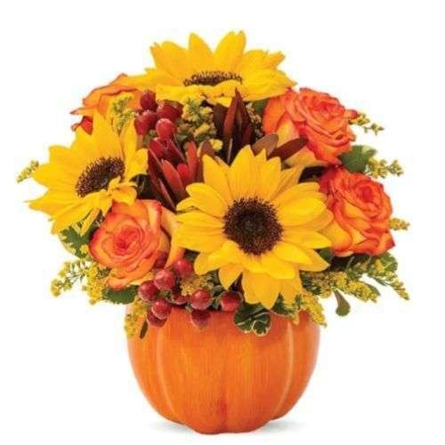 Calabaza con girasoles rosas proteas e hypericum adock para la decoracion de su home para celebrar halloween , dele un toque de elegancia con este arreglo floral