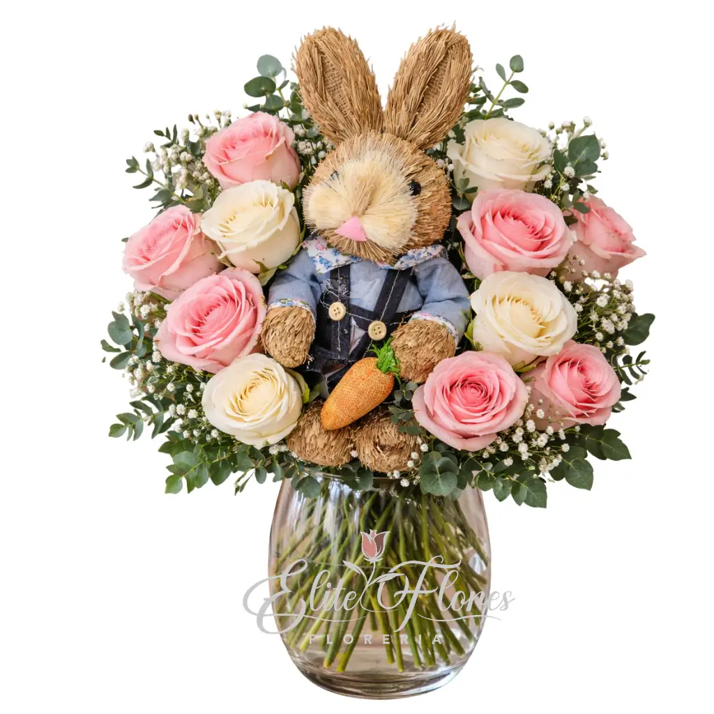 Celebra la magia de la Pascua con nuestro exclusivo florero con conejo de Pascua, una composición floral delicada y llena de significado. Este arreglo combina flores frescas de temporada cuidadosamente seleccionadas con un adorable conejo decorativo, creando un regalo perfecto para sorprender, decorar o transmitir cariño en fechas especiales.