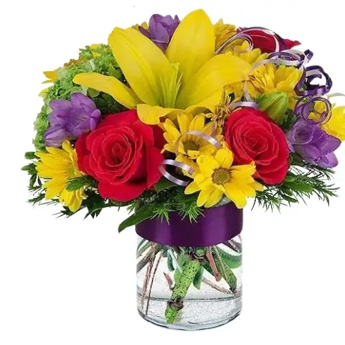 Un florero de cumpleaños alegre y surtido es el regalo perfecto para celebrar la vida y alegrar el día de esa persona especial en su día especial. Este vibrante arreglo floral está compuesto por una selección de flores coloridas y alegres que transmiten felicidad y buenos deseos.