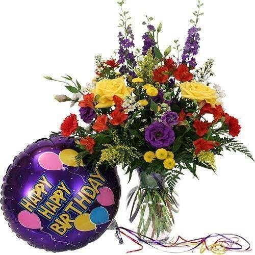 Este regalo de flores más globo de cumpleaños parece explotar con color y emoción, emitiendo la «vibra» de un verdadero espectáculo de fuegos artificiales