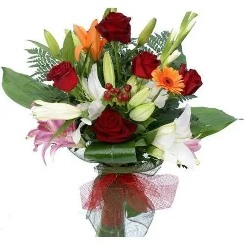 Deje que su amor brille con este brillante florero de 5 rosas rojas, 2 lilium blancos y gerberas.