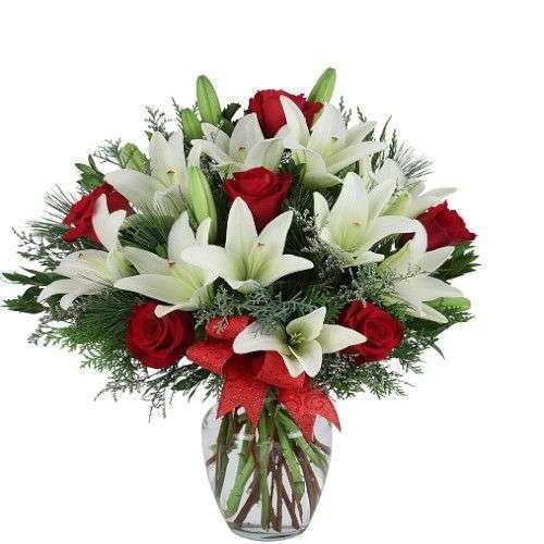 El rojo y el blanco son colores navideños tan clásicos, y este arreglo con florero de vidrio transparente con lilium blancos como la nieve y rosas rojas con toques de limonium agregado ¡lo demuestra!