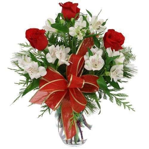 Un florero con rosas y alstroemelias suena bastante simple… pero cuando los arregla un diseñador con años de experiencia con hojas verdes de temporada y un gran lazo rojo, ¡va de lo simple a lo elegante!