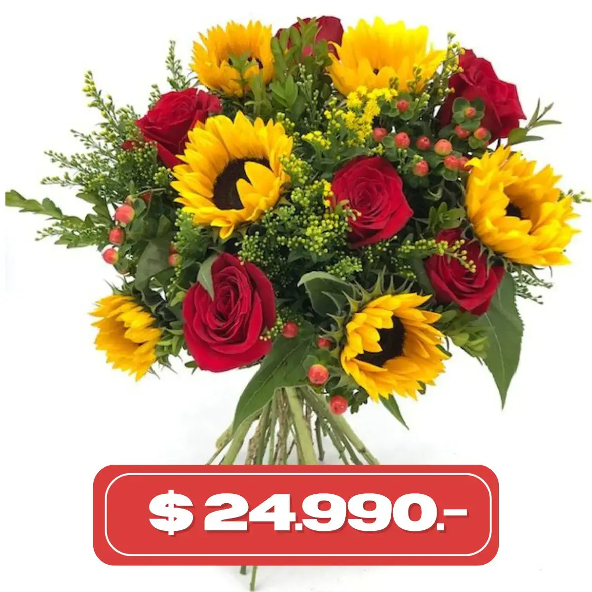 Este vibrante ramo floral mixto combina la pasión de las rosas, la alegría de las gerberas, la delicadeza de las alstroemerias y el toque silvestre del mable. Una explosión de color y textura ideal para decorar el hogar o regalar en cualquier ocasión especial.