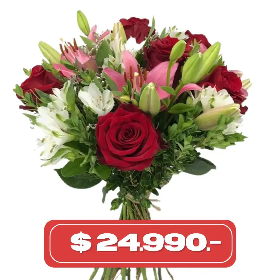 Este sofisticado ramo combina la intensidad de las rosas rojas, la suavidad de los lilium rosados y la pureza de los lilium blancos, creando un arreglo perfecto para llenar tu hogar de estilo, frescura y armonía. Ideal para decorar espacios como la sala, comedor o recibidor con un toque romántico y moderno.