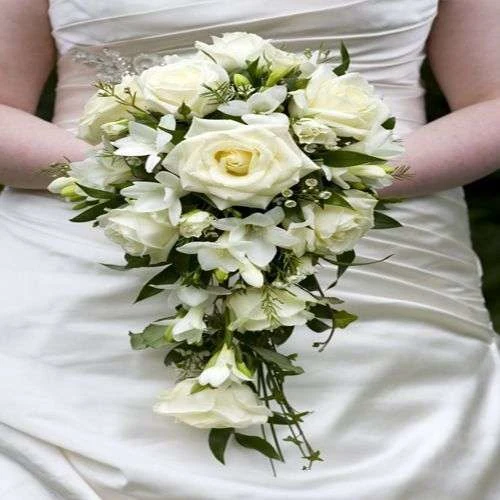 Ramo alargado de rosas blanca, con flor blanca pequeña según temporada