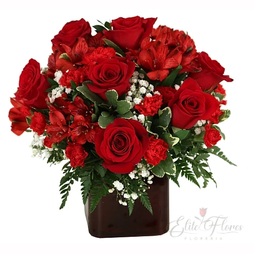 Florero de altura pequeña con 6 rosas rojas, astromelias, gypsophilia. y follaje.