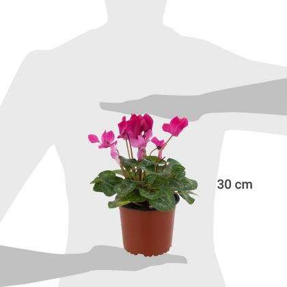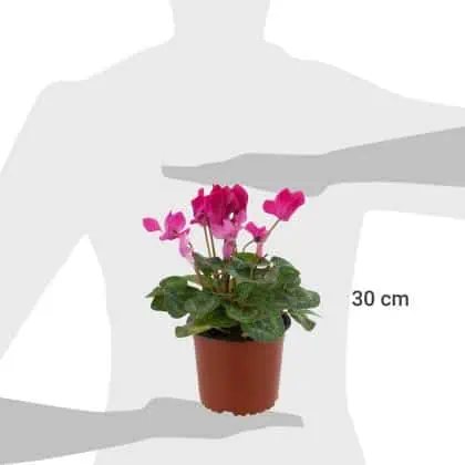 Violetas de persia presentada en maceta de 12 cm. Planta vivaz de exterior con tallo carnoso subterráneo que rebrota cada año. Flores vistosas en varios colores que van del amarillo, rosa, naranja, etc. Florecen en primavera-verano. Requiere exposición en semisombra, riego moderado y trasplante sobre sustrato universal. Altura aproximada: 40 cm.
