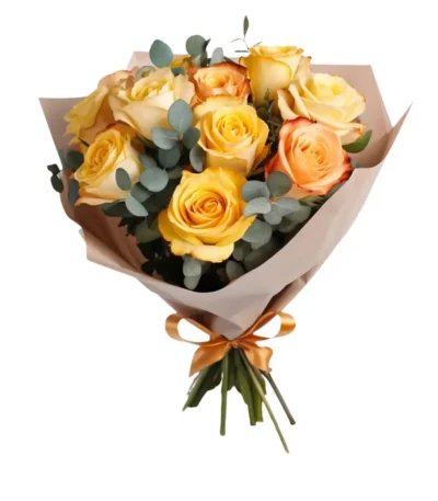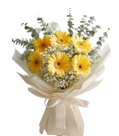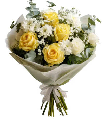 Un bouquet que susurra la serenidad de una mañana luminosa y en calma. Integra rosas amarillas, rosas blancas, crisantemos blancos y eucalipto fresco, logrando un equilibrio delicado entre la calidez dorada y la pureza inmaculada.