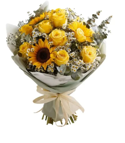 Un bouquet que enciende el día con su luz auténtica y encanto natural. Lleva 3 girasoles luminosos, 10 rosas amarillas intensas, sutil manzanilla y eucalipto fresco, logrando una mezcla cálida, armónica y llena de vida. Ideal para celebrar cumpleaños, dar las gracias o sorprender con flores amarillas a domicilio que hablan de optimismo sin decir una sola palabra.